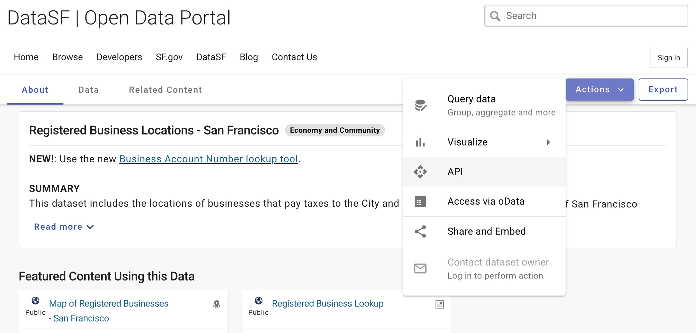 You can generate an API endpoint from any dataset's primer page (E.g. Registered Business), by clicking “ACTIONS” and then selecting “API”. Endpoints can be created for different formats, including CSV, JSON, and GeoJSON (for datasets that include geospatial data).