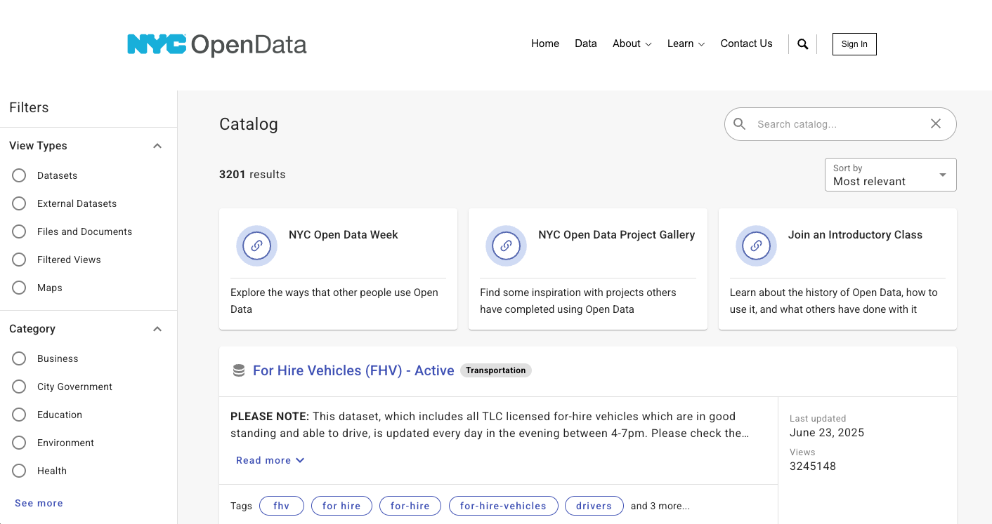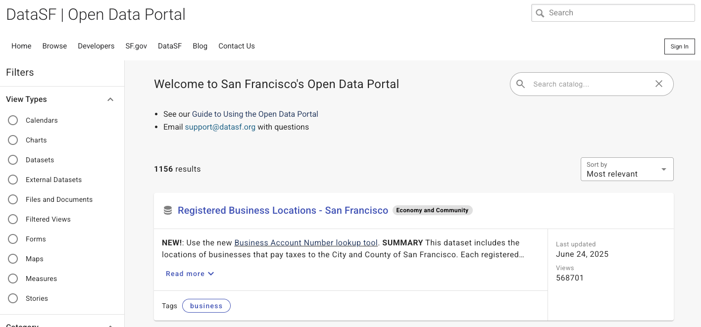 Note: These tips apply to any Open Data Portal powered by Tyler Technologies. You can often confirm this by checking the bottom of the page for a “Powered by Tyler Technologies” label. These portals share a common layout and structure—examples include those used by San Francisco and New York City.